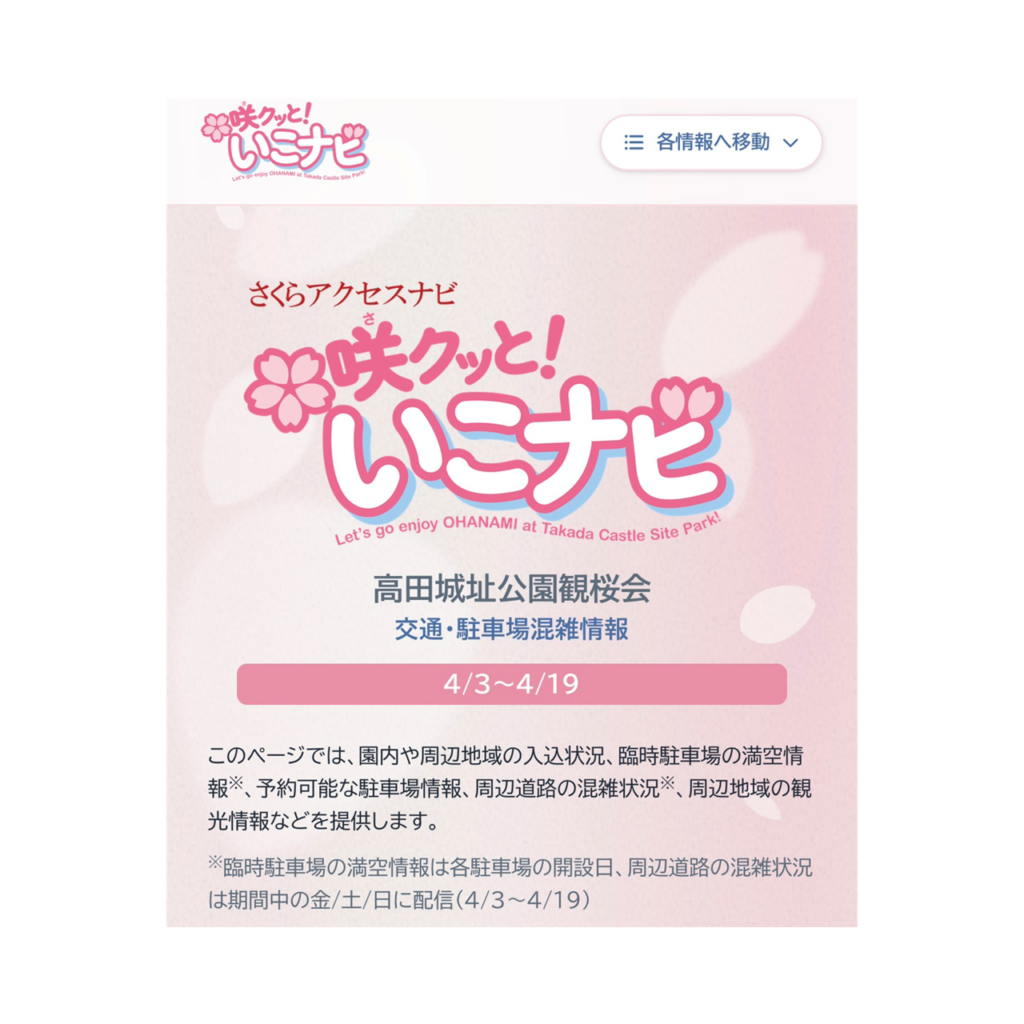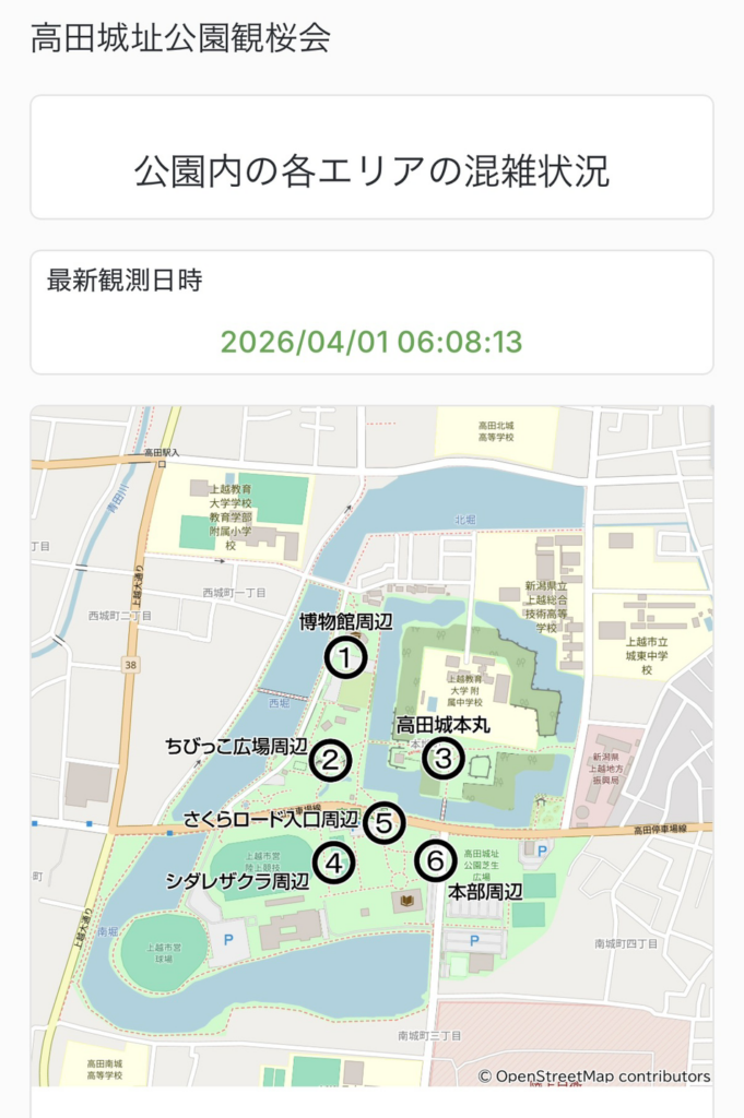 このたび構想時より当システムに期待いただいた関係各所との連携により第101回高田城趾公園観桜会における会場混雑情報にについて、当システムを用いての情報提供(一般公開)の運びとなりました。
