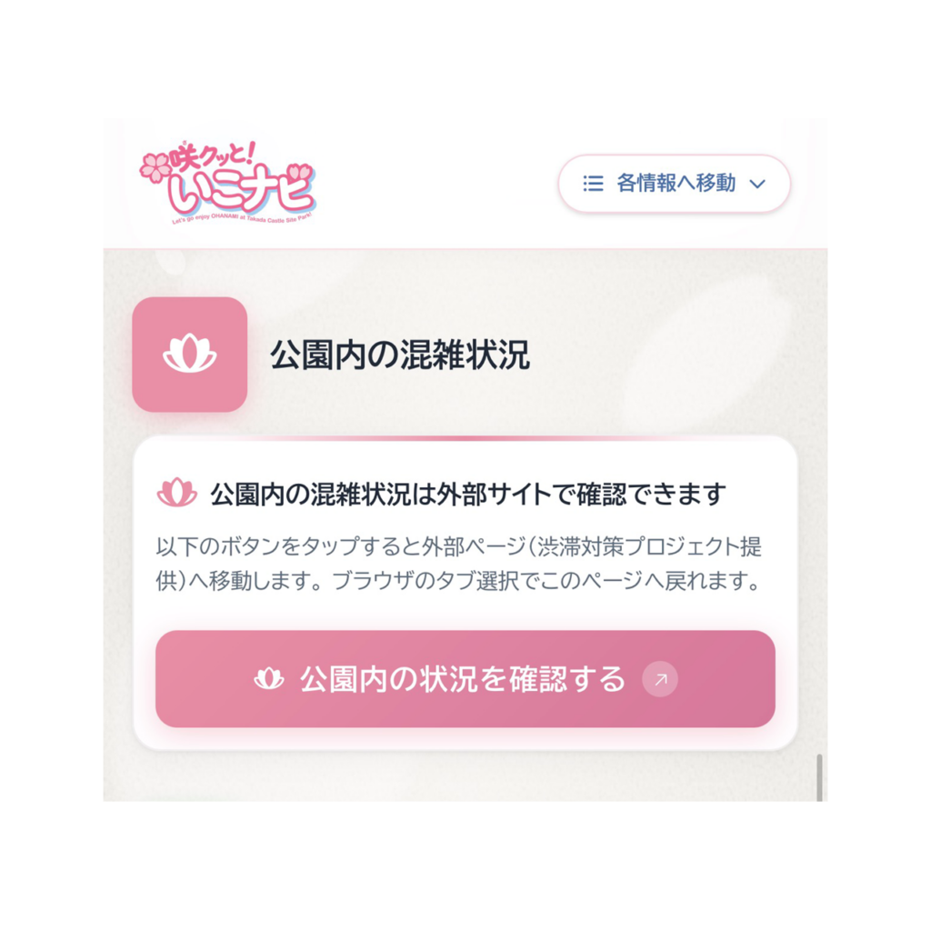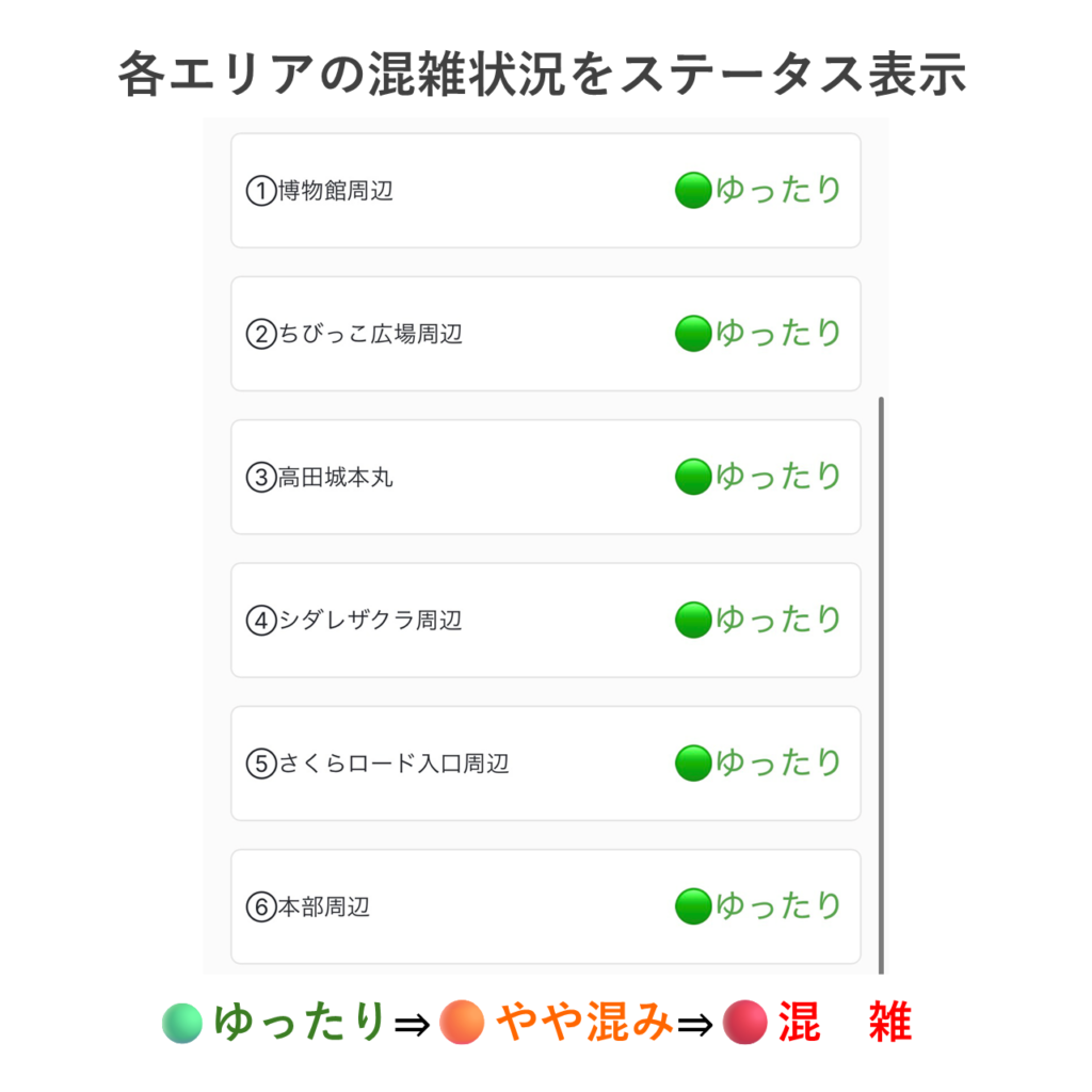 - 公園内6箇所の混雑を3段階表示(ゆったり・やや混み・混雑)
