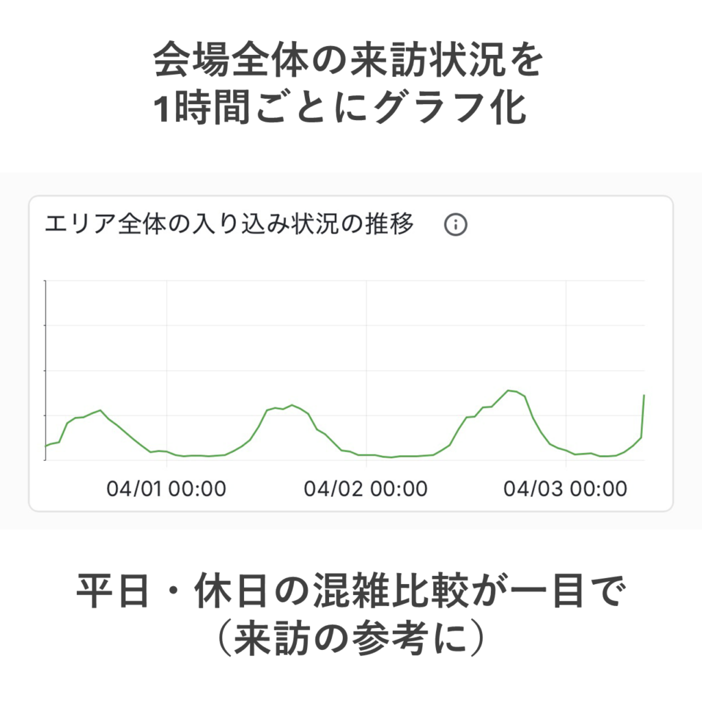 - 過去72時間の来場推移表示(会場内6箇所全体を集計し参考表示)